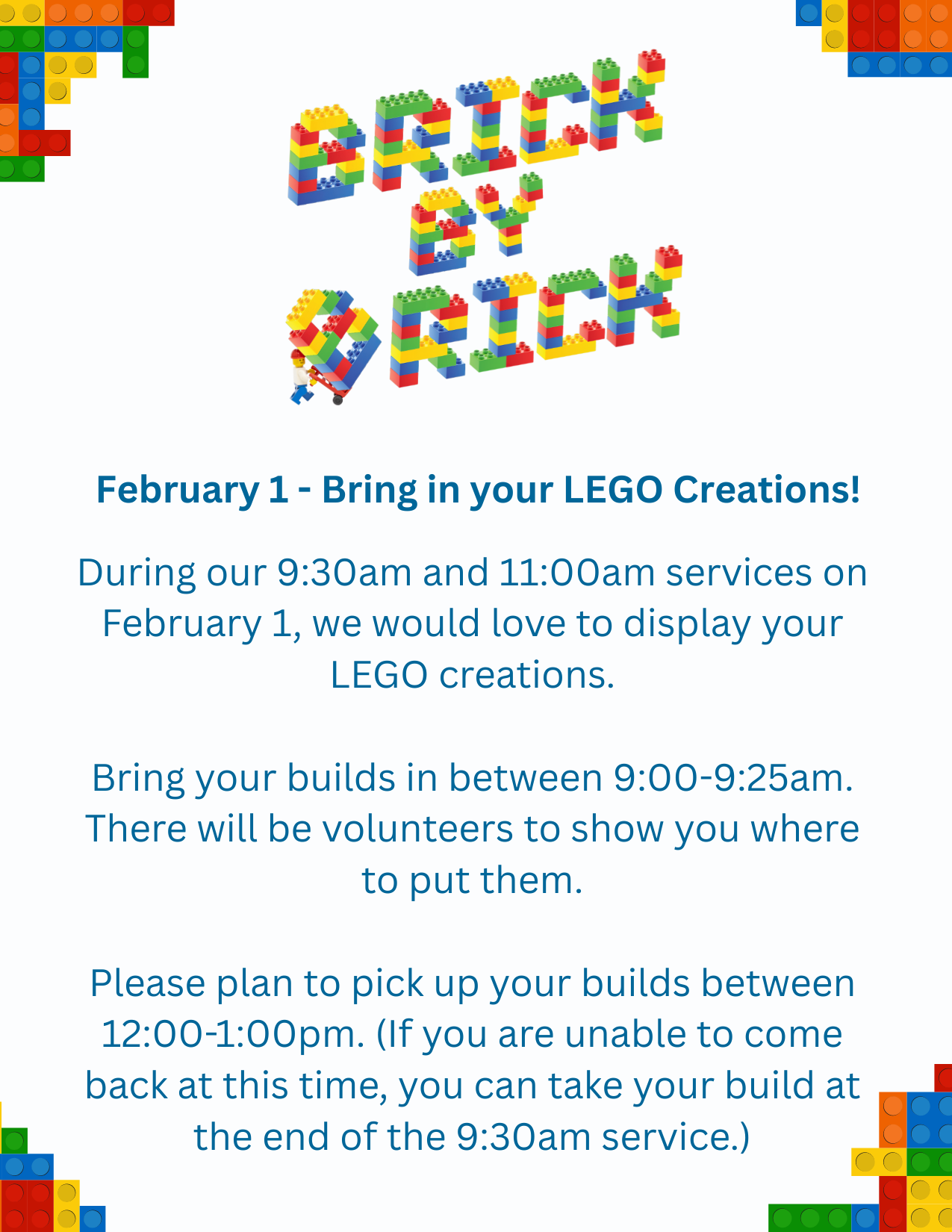 Bring in your LEGO creations to display during our Sunday services.